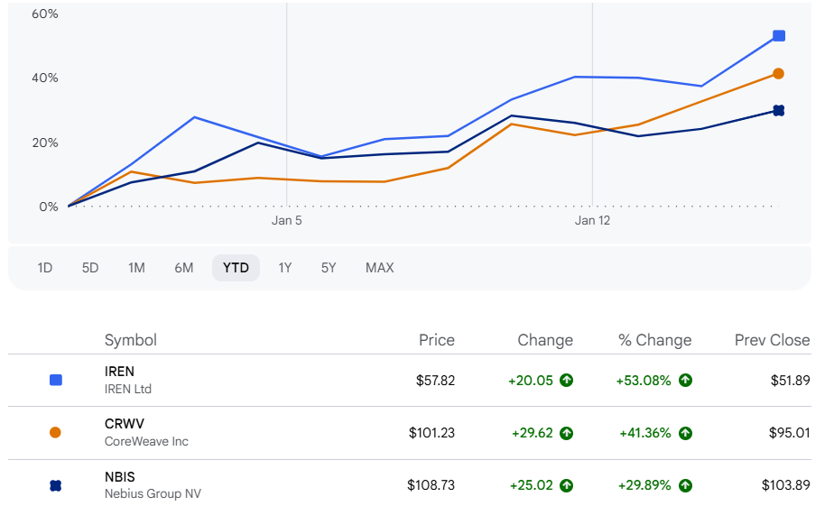 在经历上一轮急涨急跌后,围绕AI基础设施、数据中心与高性能计算的"AI云"交易正在回归,资金重新涌向更纯粹的算力供给侧标的。 2026年以来,CoreWeave累计上涨超40%,Nebius累计上涨近30%,同时覆盖高性能数据中心与比特币挖矿业务的Iren涨幅超过53%。 | | Symbol | Price | Change | % Change | Prev Close | | --- | --- | --- | --- | --- | --- | | | IREN IREN Ltd | $57.82 | +20.05 1 | +53.08% 0 | $51.89 | | ● | CRWV | $101.23 | +29.62 ↑ | +41.36% ↑ | $95.01 | | | CoreWeave Inc | | | | | | 8 | NBIS | $108.73 | +25.02 ↑ | +29.89% ↑ | $103.89 | | | Nebius Group NV | | | | | 驱动这轮反弹的关键线索集中在两点,盈利预期的改善与价格走势的"向上突破"。更重要的是,芯片端的强势信号正在 ...