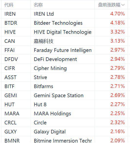 格隆汇11月17日|美股加密货币概念股盘前走高,其中,IREN Ltd、Bitdeer Technologies涨超4%,嘉楠 科技涨超3%,Strive、Bitfarms、Circle涨超2%。 | 代码 | 名称 | 盘前涨跌幅√ | | --- | --- | --- | | IREN | IREN Ltd | 4.70% | | BTDR | Bitdeer Technologies | 4.18% | | HIVE | HIVE Digital Technologie: | 3.32% | | CAN | 嘉楠科技 | 3.13% | | FFAI | Faraday Future Intelligen | 2.97% | | DFDV | DeFi Development | 2.94% | | CIFR | Cipher Mining | 2.79% | | ASST | Strive | 2.78% | | BITF | Bitfarms | 2.71% | | GEMI | Gemini Space Station | 2.69% | | HUT | Hut 8 | 2.27% | | MA ...