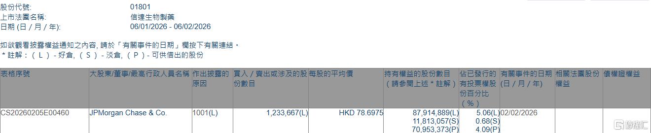 信达生物获摩根大通增持约123.37万股 每股作价约78.7港元