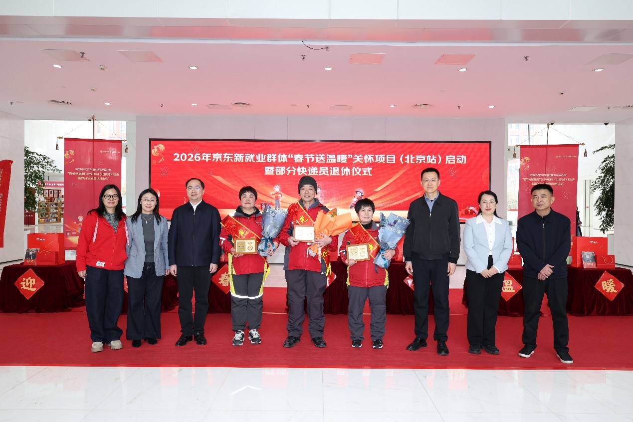 【春节送温暖 京东为多位退休快递员颁发荣休证书】2月10日,2026年京东新就业形态劳动者"春节送 温暖"关怀项目(北京站)启动暨部分快递员退休仪式在北京举行。中华全国总工会、全国妇联、中国 快递协会以及北京市委社会工作部、市委互联网企业工委、市总工会、市妇联、市邮政管理局、经开区 管委会等10部门现场参加,并为即将退休的快递员们颁发证书。(北京青年报记者 李佳 摄像 王雯雯 编 辑 郭茂勇 校对 李建良) ...
