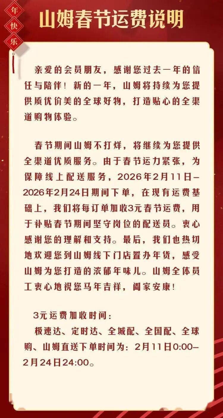 春节假期近在眼前 在线下 这几天许多店铺已结束年前营业 开始进入假期 在线上,今年各大平台 纷纷宣布"春节不打烊" 在不打烊的前提下 盒马发布通知称,春节期间(2026年2月14日0点至2月21日24点),全部用户(含X会员)通过盒马APP/盒马鲜生微信小程序/盒马支付宝小程序/淘宝小程 序/盒马作为商家入驻的其他平台下单购买[盒马鲜生/盒马mini】商品的线上配送订单,任意金额订单均按照6元/单收取基础运费;如订单商品超重,按日 常标准加收超重运费。前述期间结束后恢复日常运费标准。 对春节假期配送费用 做出了一些调整 山姆发布春节运费说明称,由于春节运力紧张,为保障线上配送服务,2026年2月11日至2月24日期间下单,山姆线上配送在现有运费基础上将每单加收3 元春节运费,用于补贴春节期间坚守岗位的配送员。 叮咚买菜表示,因春节期间运力紧张,腊月廿八0点至正月初五24点(2026年2月15日0点至2026年2月21日24点),将与往年一致,每单额外收取3元春节服 务费。 对此 不少网友表示能够理解 "大过年的,不容易" "合情合理" 不过,也有部分平台表示 春节期间不对费用进行调整 美团外卖方面,2026年 ...