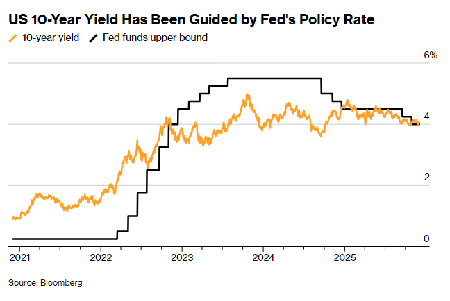 摩根大通策略师表示,由于市场对美联储降息的预期过于激进,美国国债在2026年不太可能复制今年的 强劲表现。 该行预计,10年期美国国债收益率在2025年下降约50个基点至4.08%左右后,将在明年年底前攀升至 4.35%。这一预测使摩根大通成为较为悲观的市场展望者之一。接受一项调查的经济学家和策略师预测 中值显示,10年期国债收益率将在2026年底达到4.06%。 今年以来,随着美联储已两次降息(预计下周将进行第三次降息)以支撑降温的劳动力市场,美国国债回 报率已超过6%,正迈向2020年以来的最佳年度表现。 利率互换市场显示,交易员目前押注未来一年将进行近四次25个基点的降息,其中包括12月10日的一 次。但摩根大通对美国经济更为乐观,预计仅会降息两次——分别在下周和明年1月。 摩根大通全球利率策略主管Jay Barry在一次媒体简报会上表示:"如果美联储未能兑现市场预期的降息 次数,国债收益率将出现一定程度的正常化。"他补充称,美国经济"虽面临压力但不会崩溃"。 Barry指出,根据摩根大通的公允价值模型,当前10年期收益率至少被低估了15个基点。 他还表示,投资者的仓位布局可能会放大潜在的损失。摩根大通 ...