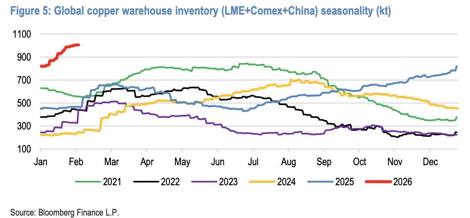 据追风交易台,摩根大通(J.P. Morgan)亚太股票研究团队于2026年2月3日发布《Copper Dashboard》(Lyndon Fagan等),指出全球可见铜库 存在一年内增长超过一倍,从去年同期的约47万吨飙升至约100万吨,达到五年新高。尽管全球矿山出现供应中断,第四季度库存仍持续 攀升,显示供需格局正在发生转变。 库存一年翻番,且矿山出问题也挡不住堆库 报告指出,截至2026年2月,全球总库存约100万吨,较2025年同期的47万吨增长113%,创5年新高。值得注意的是,这一库存增长发生 在全球矿山出现供应中断的背景下,凸显了需求端的疲软态势。 市场信号:高频指标好坏参半 摩根大通监测的多项高频指标呈现出复杂局面。一方面,铜精矿加工费(TC/RC)持续为负值,表明原料端供应依然紧张,冶炼厂在采购环 节议价能力较弱。 另一方面,伦敦金属交易所(LME)的净投机头寸开始下降,取消仓单数量也在减少。这些信号显示投资者情绪趋于谨慎,市场对短期价 格走势的信心有所动摇。截至2026年2月初,铜价维持在每磅约5.30美元的水平,但技术面和情绪面均显示短期承压。 后市展望:盘整为主,等待需求明朗 综合各项 ...
