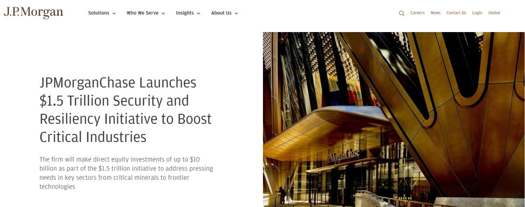 1.5 万亿计划出台:动因与核心定位 JPMorgan Chase 对外公布了一项十年期的 "安全与韧性计划"(Security and Resiliency Initiative),总规模一上来就给到 1.5 万亿美元。 计划圈定了四大核心投资方向,前沿与战略技术是其中的重点,而人工智能,正是这一领域里用来撑住产业韧性的核心技术。 还有通过贷款、帮着承销股票债券、对接第三方融资凑的钱,算下来比 "正常情况" 能多释放 5000 亿美元融资。 | Key themes | Vertical description | Select sub-areas | Description | | --- | --- | --- | --- | | | Reshoring key industries and building robust. | Advanced Bulk Materials Critical Minerals Mining & Processing | Materials incl. dielectrics & polymers enhancing functionalities Extracting ...