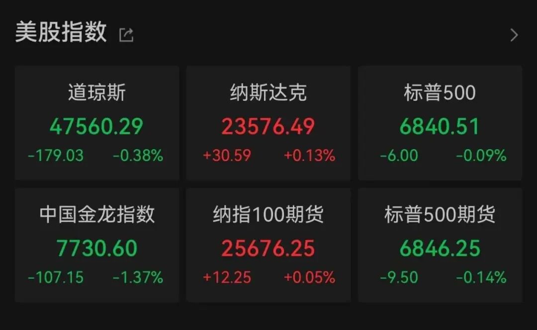 【导读】美股三大股指涨跌不一,摩根大通发出成本预警 隔夜美股三大股指涨跌不一,投资者预计即便美联储本周降息,仍可能释放偏鹰派信号。大型科技股涨跌不一,摩根大通警告2026年支出将大幅增加,拖 累银行股表现,限制大盘涨幅。特朗普在最新访谈中表示,支持立即大幅降息将成为其选择新任美联储主席的关键标准。 道指、标普指数收跌 美东时间12月9日(周二),美股三大指数收盘涨跌不一。截至收盘,道琼斯工业指数下跌0.38%,报47560.29点;纳斯达克指数上涨0.13%,报23576.49 点;标普500指数下跌0.09%,报6840.51点。 美联储周二已启动为期两天的政策会议,尽管通胀率仍高于2%的目标,交易员普遍预计本周将降息25个基点。 近期,一部分官员担忧通胀卷土重来,另一些人则更担忧劳动力市场的健康状况。美国劳工部最新发布的报告显示,10月职位空缺小幅上升,但招聘仍然 疲软;此外,美国独立企业联合会(NFIB)的报告显示,企业计划在未来增加岗位的意愿有所提升。 ClearBridge经济与市场策略主管Jeff Schulze表示,当前市场倾向认为,美联储会因职位空缺数据而略显鹰派。 芝商所FedWatch观察 ...