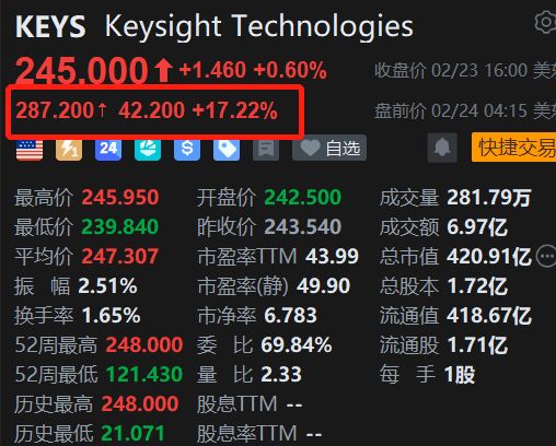 | KEYS Keysight Technologies | | | | --- | --- | --- | | 245.000 ↑ +1.460 +0.60% 收盘价 02/23 16:00 美 | | | | 287.200 + 42.200 +17.22% | | 盘前价 02/24 04:15 美 | | 第2回 3 2 8 8 8 8 2 2 2 2 1 | | ● 快捷交易 | | 最高价 245.950 | 开盘价 242.500 | 成交量 281.79万 | | 最低价 239.840 | 昨收价 243.540 | 成交额 6.97亿 | | 平均价 247.307 | 市空室 43.99 | 总市值 420.91亿 (m | | 振 幅 2.51% | 市盈率(静) 49.90 | 总股本 1.72亿 | | 换手率 1.65% | 市净率 6.783 | 流通值 418.67亿 | | 52周最高 248.000 | 委 比 69.84% | 流通股 1.71亿 | | 52周最低 121.430 | 量 比 2.33 | 色 手 1股 | | 历史最高 248.000 | 股息TTM ...
