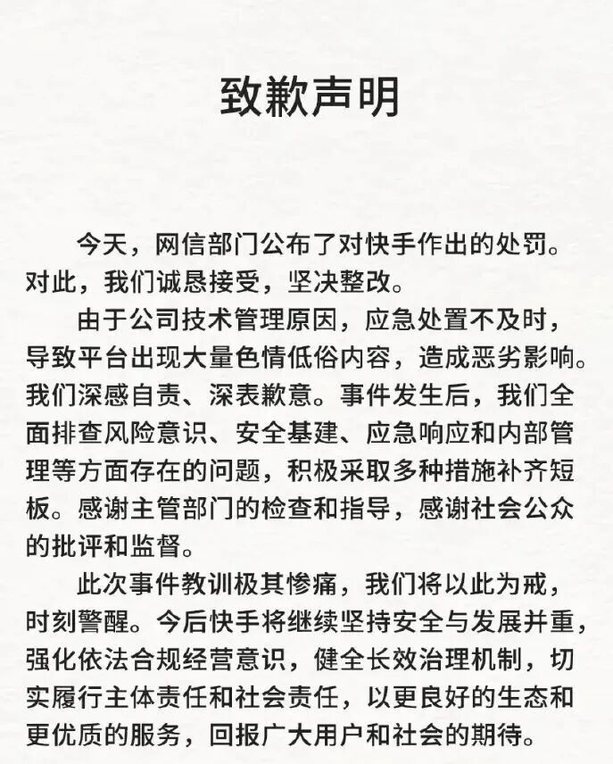 快手道歉:由于公司技术管理原因,应急处置不及时,导致平台出现大量色情低俗内容,造成恶劣影响,深感自责!将以此为戒,时刻警醒
