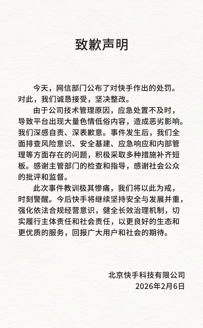 【1.191亿罚款后,快手致歉!】2月6日,快手发布声明称:"今天,网信部门公布了对快手作出的处 罚。对此,我们诚恳接受,坚决整改。" 快手表示,"由于公司技术管理原因,应急处置不及时,导致平台出现大量色情低俗内容,造成恶劣影 响。深感自责,深表歉意。事件发生后,我们全面排查风险意识,安全基建,应急响应和内部管理等方 面存在的问题,积极采取多种措施补齐短板。感谢主管部门的检查和指导,感谢社会公众的批评和监 督。 此次事件教训极其惨痛,我们将以此为戒,时刻警醒。今后快手将继续坚持安全与发展并重,强化依法 合规经营意识,健全长效治理机制,切实履行主体责任和社会责任,以更良好的生态和更优质的服务, 回报广大用户和社会的期待。"(第一财经) 北京快手科技有限公司 2026年2月6日 ...
