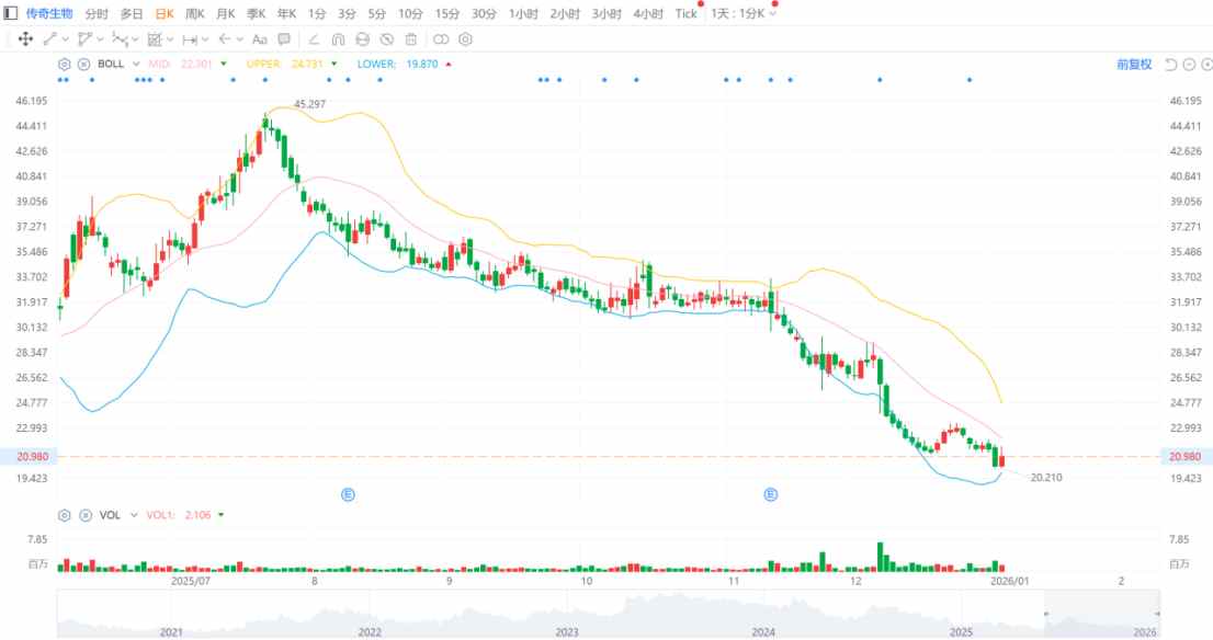 1月6日,传奇生物(LEGN.US)股价在开盘5分钟内出现一波下探,虽然后续出现大幅反弹带动日内最高涨幅突破6%,但那波下探却将传奇生物在2026年的股 价最低点定格在了20.21美元。 如果以2025年7月23日盘中的45.29美元年内高点作为起点,传奇生物在5个半月时间内股价显然经历了一波"腰斩",区间最大跌幅达到了55.38%。 传奇生物的如此表现显然让不少投资者"大跌眼镜"。毕竟在7月21日,也就是传奇生物股价达到2025年内高点的前2天,这家公司还登上了各大投行研报头 条。21位分析师中有20位给出"买入"评级,平均目标价76.42美元,较其7月18日收盘价股价41.59美元存在高达83.74%的上涨空间。 而如今,随着这家公司阶段性股价低点刷新,市场对于其的估值判断却到了之前未曾想过的一个十字路口:传奇生物是增长空间丧失还是黄金坑越挖越深? 从低位震荡到加速下跌 结合BOLL线回看传奇生物这段长达5个半月的股价跌幅区间,可以看到,在去年7月23日盘中触顶后,传奇生物便走出了一段持续14个交易日的快速下跌行 情,股价从BOLL线上轨快速跌至下轨。 这一段是属于较为典型的针对前期较大股价涨幅的技术性回 ...