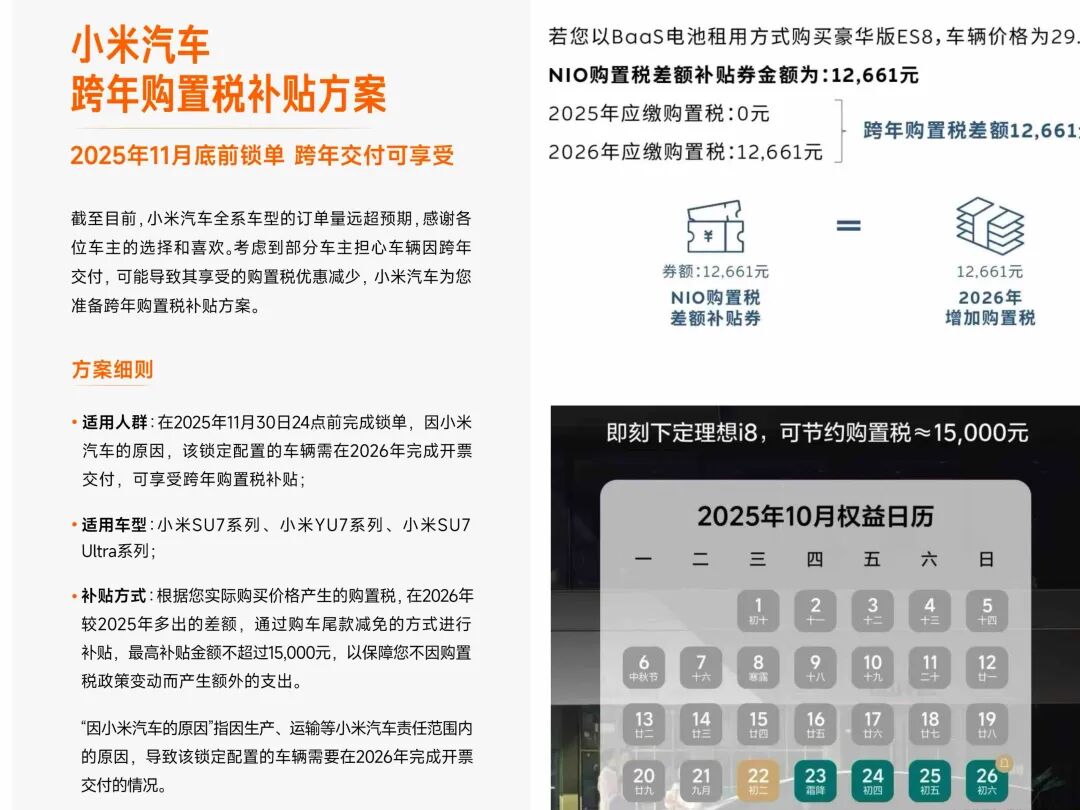 " 您好,10 月 26 日前下单理想 i8 可确定今年提车,能省下 1.5 万购置税。" 随着 2025 年年末将至,长达十余年的免征购置税迎来尾声,理想汽车也已经增加了购置税相关的销售话术。除此之外,小米汽车也在 10 月 24 日上线了 购置税兜底政策,计划对 11 月底前内锁单跨年交付的车主进行税费差额全补。 在2023年新能源车车辆购置税减免政策公告中,明确提到在今年及之前的新能源汽车免征车辆购置税,每辆乘用车免税额不超过 3 万。明年开始到 2027 年末,新能源汽车减半征收车辆购置税,其中每辆新能源乘用车减税额不超过 1.5 万元。 10 月 9 日,工信部等三部门再次发布公告,就 2026-2027 年减免车辆购置税新能源汽车产品技术要求进一步公布说明。其中指出,2026-2027 年减免车辆 购置税的插电式( 含增程式 )混合动力乘用车纯电动续驶里程应满足有条件的等效全电里程不低于 100 公里,较此前的不低于 43 公里的要求翻番。 打个比方,在 2024 年至 2025 年期间,一辆标价 40 万元的车,扣除增值税等等,其计税基数为 35.4 万元。用计税基数乘以 10% 购置税,得出应 ...
