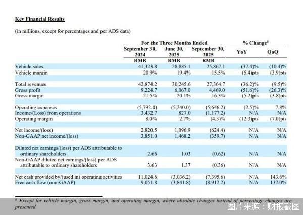 转自:中国商报 【理想汽车三季度由盈转亏!MEGA召回导致损失约11亿元】11月26日,理想汽车发布三季度财报。 2025年第三季度,理想汽车营收274亿元,同比减少36.2%,环比减少9.5%。第三季度毛利为45亿元, 同比下降51.6%,环比下降26.3%。净亏损6.24亿元,去年同期盈利28亿元,由盈转亏。第三季度交付量 为93211辆,同比下降39%。理想汽车预计第四季度营收265亿至292亿元,市场预估372.5亿元。理想汽 车预计第四季度交付量为100000至110000辆,市场预估135633辆。财报称,第三季度该公司毛利率 16.3%,毛利为44.69亿元;若剔除MEGA召回支出影响,则毛利率为20.4%。由此计算,MEGA召回事 件导致理想汽车第三季度损失约11.13亿元。你更好看哪个新能源汽车品牌?#理想汽车Q3财报##理想汽 车发布25年Q3财报##理想i6电池将启用双供应商模式# (来源:中国商报) ...