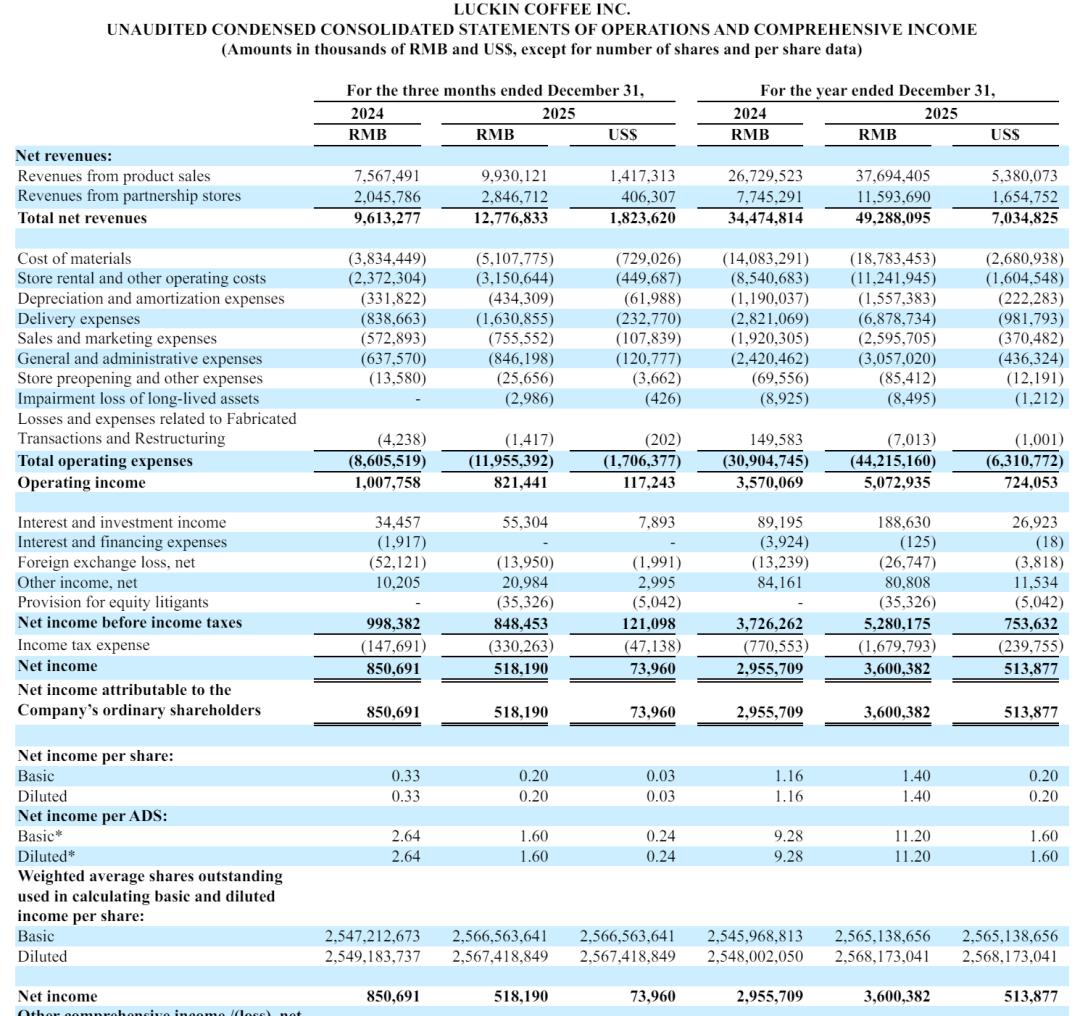 瑞幸咖啡(Luckin Coffee,OTC: LKNCY)26日发布截至2025年全年及第四季度的财报。财报显示,瑞幸咖啡2025年营收为492.88亿元(约70.35亿美元), 较上年同期的344.75亿元增长43%。 | | | For the three months ended December 31, | | | For the year ended December 31, | | | --- | --- | --- | --- | --- | --- | --- | | | 2024 | 2025 | | 2024 | 2025 | | | | RMB | RMB | USS | RMB | RMB | US$ | | Net revenues: | | | | | | | | Revenues from product sales | 7.567.491 | 9.930.121 | 1.417.313 | 26,729,523 | 37.694.405 | 5.380.073 | | Revenues from partnership stores | 2.045.786 | 2,846,7 ...