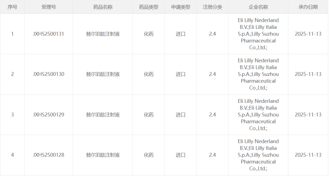 2024年5月,替尔泊肽首次在我国获批上市,用于在饮食控制和运动基础上,接受二甲双胍和/或磺脲类药物治疗血糖仍控制不佳的成人2型糖尿病(T2DM) 患者。 2024年7月,替尔泊肽又在我国获批一项新适应症:用于在控制饮食和增加运动基础上,体重指数(BMI)符合以下要求的成人的长期体重管理:≥28 kg/m2(肥胖),或≥24 kg/m2(超重)并伴有至少一种体重相关合并症(如:高血压、血脂异常、高血糖、阻塞性睡眠呼吸暂停、心血管疾病等)。 今年6月,替尔泊肽又在华获批第三项适应症:用于治疗成人肥胖患者的中度至重度阻塞性睡眠呼吸暂停(OSA)。 智通财经APP获悉,11月13日,CDE官网显示,礼来(LLY.US)的葡萄糖依赖性促胰岛素多肽(GIP)和胰高血糖素样肽-1(GLP-1)受体双重激动剂替尔泊肽注 射液新适应症上市申请已获得受理。这是该药品在华第三项适应症获批后又一次申报。 | 序号 | 会睡着 | 药品名称 | 药品类型 | 申请类型 | 注册分类 | 企业名称 | 承办日期 | | --- | --- | --- | --- | --- | --- | --- | --- | | 1 | JXHS ...