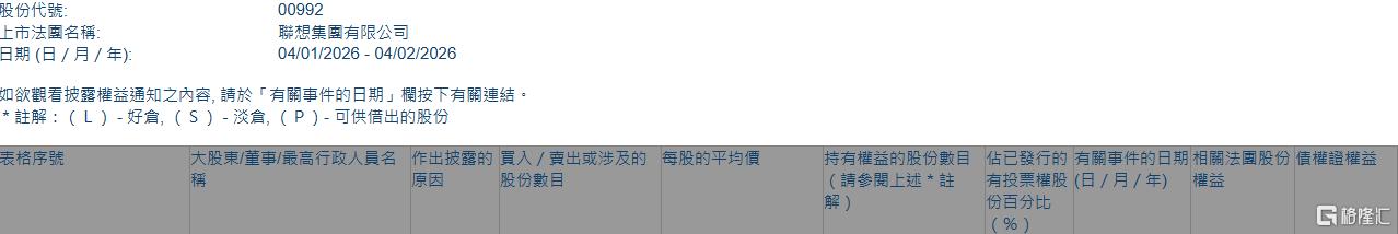格隆汇2月4日丨根据联交所最新权益披露资料显示,2026年1月29日,联想集团(00992.HK)获JPMorgan Chase & Co.以每股均价9.0212港元增持好仓5477.26万 股,涉资约4.94亿港元。 增持后,JPMorgan Chase & Co.最新持好仓数目为911,794,651股,持好仓比例由6.90%上升至7.35%。 | 股份代號: | 00992 | | --- | --- | | 上市法國名稱: | 聯想集團有限公司 | | 日期 (日 / 月 / 年): | 04/01/2026 - 04/02/2026 | | 表格序號 | 大股東/董事/最高行政人員名 作出披露的 買入 / 費出或涉及的 每股的平均價 | | | 持有權益的股份數目 佔已發行的 有關事件的日期 在 | | | | --- | --- | --- | --- | --- | --- | --- | | | 股份數目 | 泉内 | | | | 有投票權股 (日 / 月 / 年) | | | | | | | | 元三十六 I | | | | | | | | 896 | | CS20260203E00400 ...