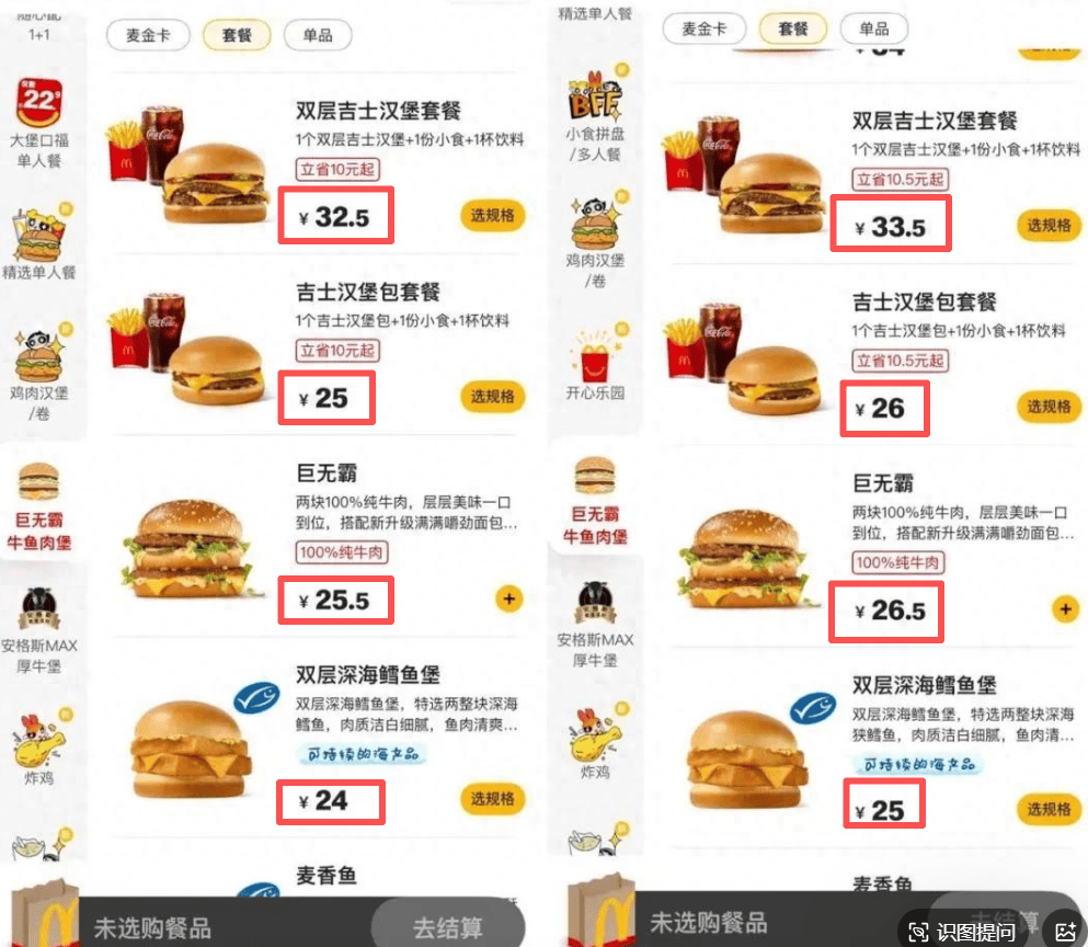 "从来不涨价"的麦当劳,居然涨价了。 | PHILT HILL 1+1 | 麦金卡 | 套餐 | 单品 | | 精选单人管 | 麦金卡 | 套餐 | 单品 | | --- | --- | --- | --- | --- | --- | --- | --- | --- | | | | | 双层吉士汉堡套餐 1个双层吉士汉堡+1份小食+1杯饮料 | | 小食拼盘 | | | 双层吉士汉堡套餐 1个双层吉士汉堡+1份小食+1杯饮料 | | | 111 | | 立省10元起 | | /多人餐 | | | | | | | | | | | | | 立省10.5元起 | | | | | ¥ 32.5 | 选规格 | | | | ¥ 33.5 选规格 | | 精选单人警 | | | 吉士汉堡包套餐 | | 鸡肉汉堡 1年 | | | 吉士汉堡包套餐 | | | | | 1个吉士汉堡包+1份小食+1杯饮料 | | | | | 1个吉士汉堡包+1份小食+1杯饮料 | | | 68 | | 立省10元起 | | | | | 立省10.5元起 | | 鸡肉汉堡 1 举 | | | ¥ 25 | 近规格 | 开心分云 | | | ¥ ...