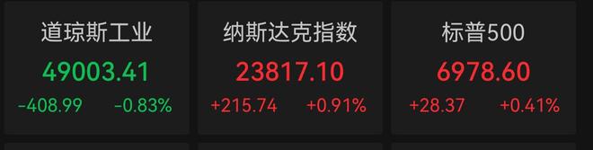 智通财经APP获悉,周二,三大指数走势分化,盘中,标普500指数最高上涨至6988.82点,创盘中历史 新高。 【美股】截至收盘,道指跌408.99点,跌幅为0.83%,报49003.41点;纳指涨215.74点,涨幅为0.91%, 报23817.10点;标普500指数涨28.37点,涨幅为0.41%,报6978.60点。美光科技(MU.US)涨5.4%,英特 尔(INTC.US)涨超3%。纳斯达克中国金龙指数涨0.48%。 【欧股】德国DAX30指数跌70.17点,跌幅0.28%,报24880.13点;英国富时100指数涨52.90点,涨幅 0.52%,报10201.75点;法国CAC40指数涨21.67点,涨幅0.27%,报8152.82点;欧洲斯托克50指数涨 34.76点,涨幅0.58%,报5992.56点;西班牙IBEX35指数涨108.72点,涨幅0.61%,报17789.22点;意大 利富时MIB指数涨467.18点,涨幅1.04%,报45417.50点。 【加密货币】比特币突破8.9万美元,以太坊突破3000美元。 【美元指数】衡量美元对六种主要货币的美元指数当天下跌0.84%,在汇市尾市收于 ...