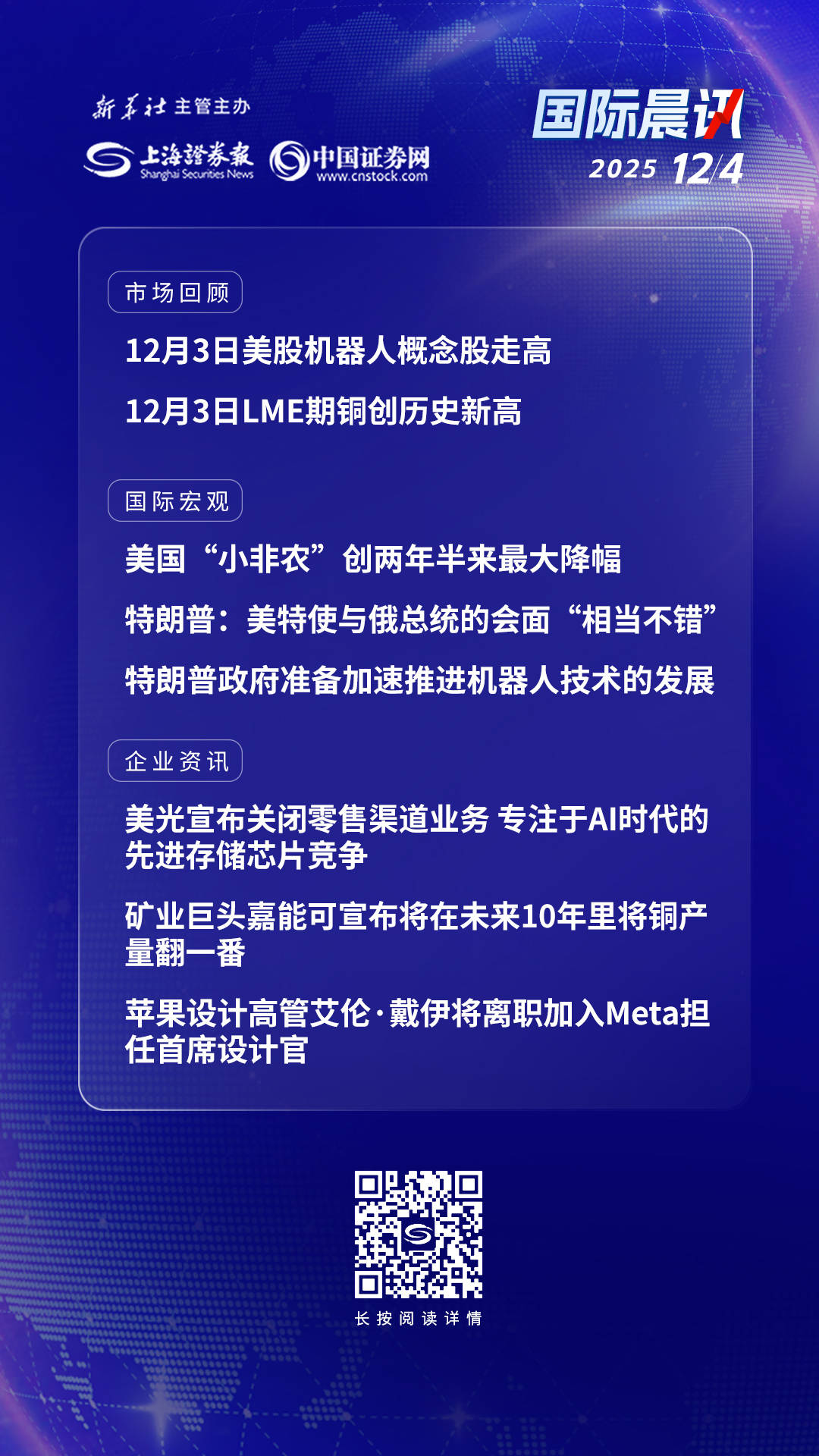 新 3 社 主管主办 上海登录家 中国山 参加 市场回顾 12月3日美股机器人概念股走高 12月3日LME期铜剑历史新高 国际宏观 美国"小非农"创两年半来最大降幅 特朗普:美特使与俄总统的会面"相当不错" 特朗普政府准备加速推进机器人技术的发展 企业资讯 美光宣布关闭零售渠道业务 专注于AI时代的 先进存储芯片竞争 矿业巨头嘉能可宣布将在未来10年里将铜产 量 -- 答 苹果设计高管艾伦·戴伊将离职加入Meta担 任首席设计官 12月3日,伦敦金属交易所(LME)的铜价刷新历史新高,交易所数据显示,提货订单出现自2013年以来最大单日增幅。沪铜期货主力合约站上9万元/吨 大关,亦创历史新高。 nd station 【市场回顾】 12月4日,日经225指数涨0.14%,报49932.93点;韩国KOSPI指数跌0.43%,报4018.91点。 美东时间周三,美股三大指数低开高走,集体收涨。截至收盘,标普500指数涨0.3%,报6849.72点;纳斯达克综合指数涨0.17%,报23454.09点;道琼斯 工业平均指数涨0.86%,报47882.9点。 美东时间周三,美股机器人概念股走高,Nauticus Rob ...