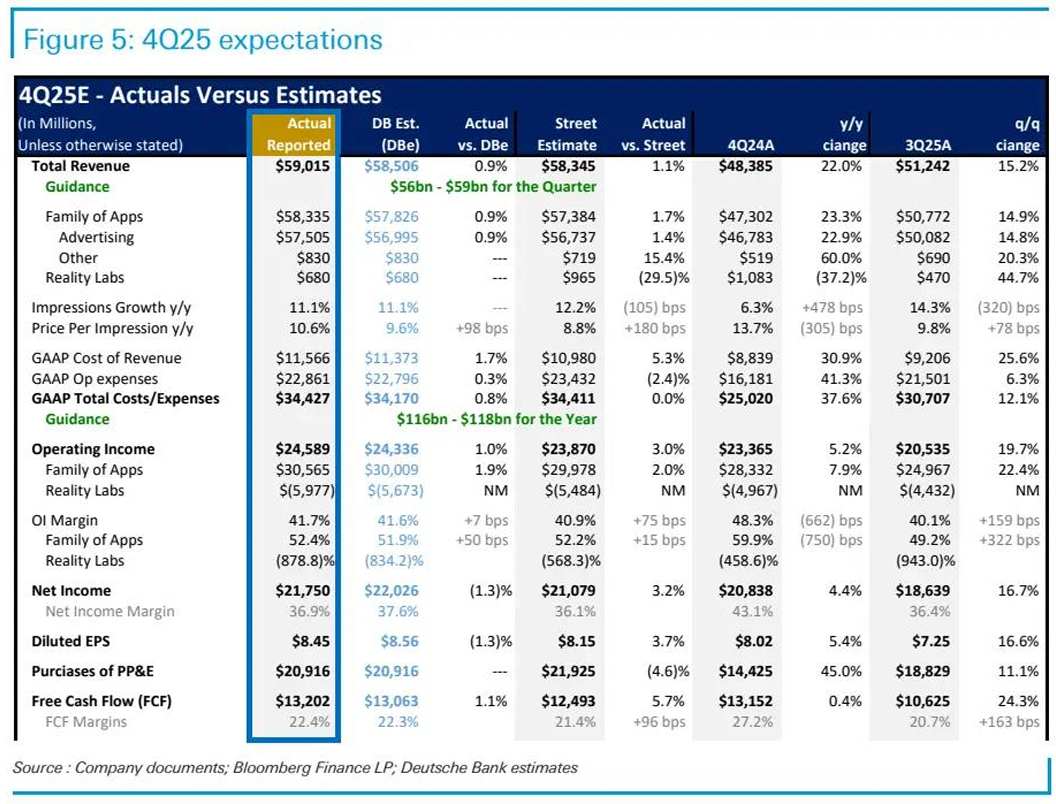 智通财经APP获悉,Meta Platforms(META.US)将于1月28日(周三)美股盘后公布2025年第四季度业绩。德意志银行发布报告称,预计Meta Q4营收将达 到590亿美元(同比增长22%),高于此前预计的585亿美元;预计Q4总支出为344亿美元,这将使全年总支出处于该公司给出的1160-1180亿美元预测区间 的中点。对于2026年第一季度,德银预计,营收将同比增长23%至519亿美元,市场共识预期为512亿美元;预计总支出将同比增长32%至326亿美元,市 场共识预期为331亿美元。德银在报告中予Meta"买入"评级,目标价为880美元,这一目标价较该股上周五收盘价有约34%的上涨空间。 | 4Q25E - Actuals Versus Estimates | | | | | | | | | | | --- | --- | --- | --- | --- | --- | --- | --- | --- | --- | | (In Millions, | Actual | DB Est. | Actual | Street | Actual | | y/y | | d/q | | Unle ...