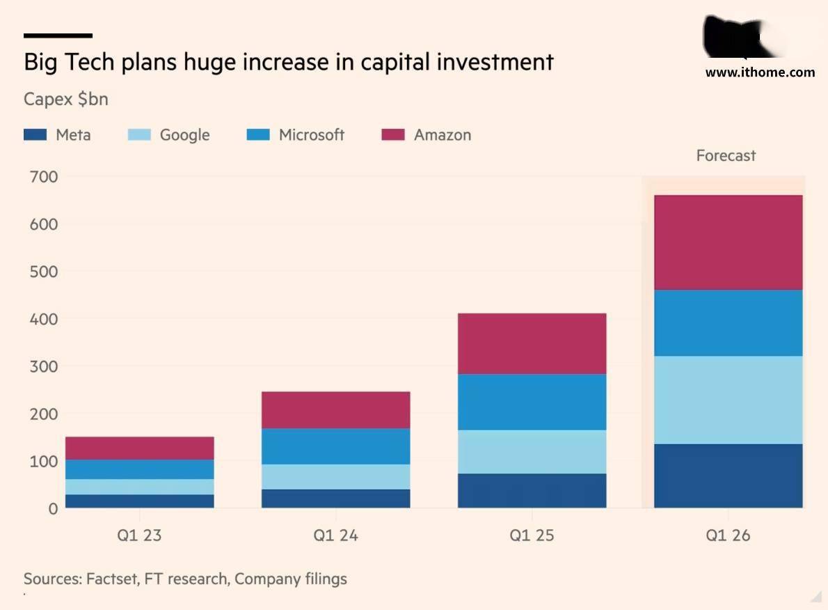 随着AI基础设施建设的军备竞赛进入"深水区",一个令投资者不安的转折点已然浮现:为了支撑AI算力需求,亚马逊、谷歌和Meta正面临自由现 金流被耗尽甚至透支的风险。 根据摩根大通2026年2月5日发布的研究报告,美国四大云巨头——亚马逊、谷歌、Meta和微软,2026年总资本支出预计将达到6450亿美元,同比 激增56%,新增支出将达到惊人的2300亿美元。 对于投资者而言,2026年,或将是紧盯科技巨头资产负债表的一年。 谷歌的97%增速与亚马逊的"现金赤字" 在这场基建狂潮中,谷歌的投入非常激进。 2026年,谷歌的资本支出指引已上调至1750亿至1850亿美元,同比增速高达97%,其资金正疯狂涌向服务器和技术基础设施。 如果说谷歌还只是在"疯狂花钱",那么亚马逊则堪称"透支未来"。 2026年,亚马逊的资本支出指引约为2000亿美元(同比增长52%)。但问题的核心在于,亚马逊赚回来的现金已经盖不住支出了——据标普全球 市场分析师预测,亚马逊2026年的运营现金流(OCF)约为1780亿美元。 这意味着,亚马逊的资本支出将超过其运营现金流,导致实质性的现金净流出(Burn Cash)。此外,据《The I ...