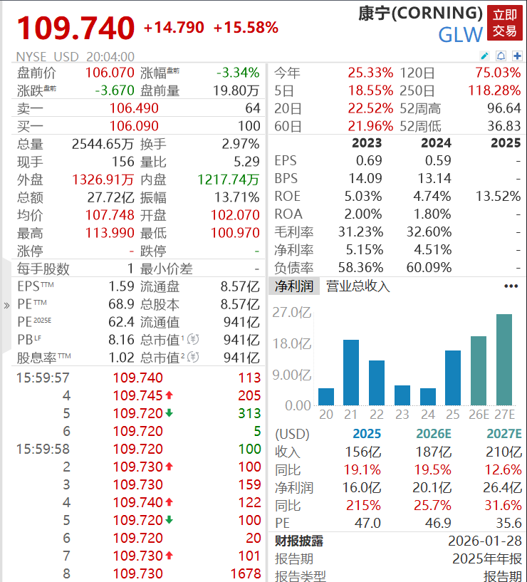 Core Insights - Corning Incorporated is a leading innovator in materials science, particularly known for its contributions to the telecommunications industry through fiber-optic technology [1] - The company has a significant multiyear fiber-optic supply deal with Meta Platforms, valued at up to $6 billion, which is expected to enhance its growth prospects [2][4] Stock Performance - Corning's stock surged by 16.7% to a record high of $110.80 following the announcement of the Meta deal, marking its best daily percentage gain since April 2004 [3] - Over the past year, Corning's stock has risen by 122.7%, with the current price at $110.77 reflecting a substantial increase of 16.66% [5] - The stock has fluctuated between a low of $100.97 and a high of $113.99, with a market capitalization of approximately $94.97 billion [5] Strategic Developments - The partnership with Meta involves supplying next-generation optical fiber, cable, and connectivity hardware, prompting Corning to increase manufacturing capacity at its North Carolina facilities [4]