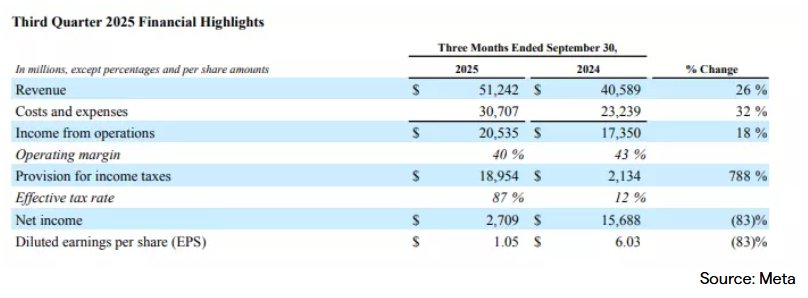 此外,该公司还表示,预计2025年全年支出将在1160亿至1180亿美元之间,较此前1140亿至1180亿美元的预期有所 上调,同比增长率为22%至24%。其中,2025年资本支出(包括融资租赁本金支付)将在700亿至720亿美元之间,高于 此前预计的660亿至720亿美元。 上一季度亮点 2025年第三季度(Q3),Meta营收达到512.4亿美元,超出预期的494.1亿美元;调整后每股收益(EPS)为7.25美元,高于 预期的6.67美元,该调整排除了一次性非现金税项支出。需要注意的是,由于美国新税法(《美丽大法案》)变化导致 的159.3亿美元非经常性税项支出,按照公认会计原则(GAAP)计算的每股收益大幅降至1.05美元。 该公司报告了2025年第三季度的以下运营亮点: 营收:达512.4亿美元,同比增长26% Meta Platforms(META.US)定于2026年1月28日(星期三)股市收盘后公布其2025年第四季度(Q4)业绩。在第三季度财报 中,Meta表示,预计2025年第四季度的营收将在560亿至590亿美元之间,伦敦证券交易所集团(LSEG)的普遍预测为 565.9亿美元,这将意味着 ...