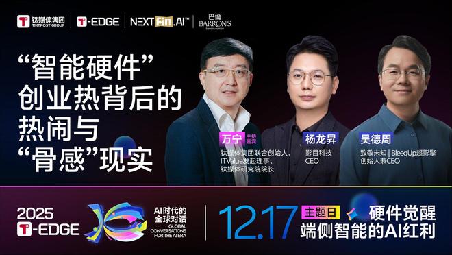 2025年12月8日至21日(北京时间),钛媒体集团携手NextFin.AI、巴伦中国举办的2025 T-EDGE 全球 对话正式开启,以连续7日全球连线+贯穿2周N场闭门私享会的方式联动上海、深圳、硅谷、香港、新 加坡、日本、迪拜等全球化创新高地,汇集前沿创新思想,打造全球分布式创新盛会,展开一场【AI 时代的全球对话 Global Conversations for the AI Era】。 12月17日,「硬件觉醒,端侧智能的AI红利」主题日中,钛媒体联合创始人万宁与致敬未知|BleeqUp超 影擎创始人兼CEO吴德周以及影目科技CEO杨龙昇两位嘉宾揭秘"智能硬件"创业热背后的热闹与"骨 感"现实。 当下,AI眼镜已成为全民关注的新焦点,除了众多创业公司入局外,Meta、苹果、谷歌、阿里、小米 等巨头也纷纷加入战场。根据IDC最新发布的报告显示,对于2025年第三季度,全球范围内智能眼镜市 场出货量429.6万台,同比增长74.1%。 值得一提的是,吴德周和杨龙昇均是手机圈的老玩家,此次创业也正是看中了AI眼镜会成为"取代"手机 的下一个超级终端。不过,在中国创业,当巨头入局后,势必会引来新一轮的洗牌。 ...
