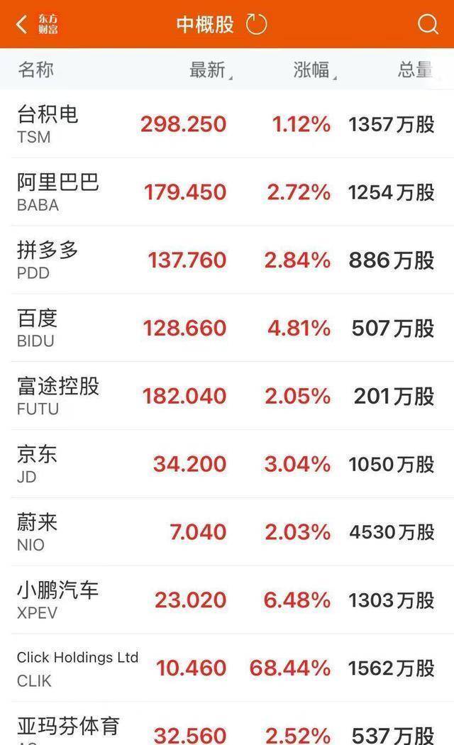 | く 制富 | 中概股 () | | O | | --- | --- | --- | --- | | 名称 | 最新 | 涨幅。 总量 | | | 台积电 | 298.250 | 1.12% 1357万股 | | | TSM | | | | | 阿里巴巴 | 179.450 | 2.72% 1254万股 | | | BABA | | | | | 拼多多 | 137.760 | 2.84% 886万股 | | | PDD | | | | | 百度 | 123.660 | 4.81% 507万股 | | | BIDU | | | | | 富途控股 | 182.040 | 2.05% 201万股 | | | FUTU | | | | | 京东 | 34.200 | 3.04% 1050万股 | | | JD | | | | | 劇来 | 7.040 | 2.03% 4530万股 | | | NIO | | | | | 小鹏汽车 | 23.020 | 6.48% 1303万股 | | | XPEV | | | | | Click Holdings Ltd | 10.460 | 68.44% 1562万股 | | | ...