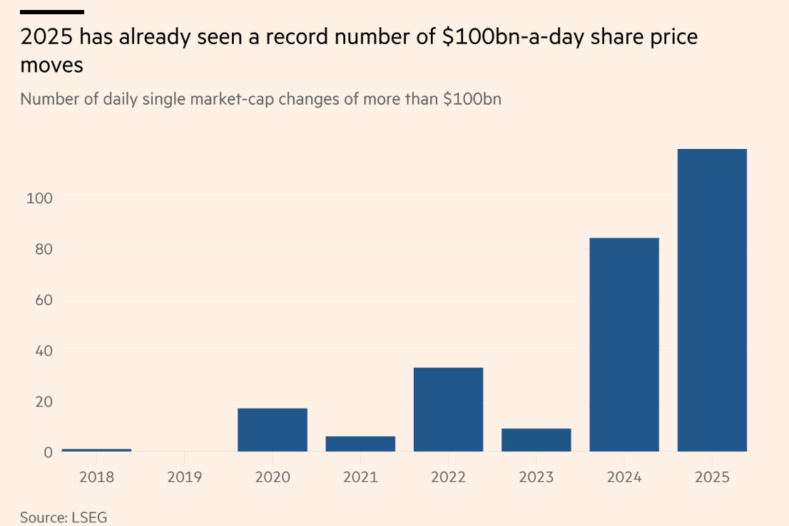 华尔街单日股价波动规模达数千亿美元已成为常态。随着推动股市持续上涨的大型科技公司波动性加剧,这一现象凸显了投资者面临的风险。 今年以来,个股单日市值涨跌超1000亿美元的情况已出现119次,创下历史年度最高纪录。 这种"千亿级"股价波动的增多,部分源于英伟达(NVDA)、微软(MSFT)、苹果(APPL)等巨头的庞大体量——这些公司市值均超过3万亿美元,是推 动大盘剧烈波动的主要力量。 但即便考虑到股市整体规模的增长,今年的波动幅度仍堪称异常。美国银行分析显示,2025年大型科技股的"脆弱性事件"(即股价波动远超常规区间)数 量,已突破2024年创下的纪录。 "如今大盘股单日波动10%、20%甚至30%都有可能,"美国银行全球跨资产量化投资策略主管阿比·德布(Abhi Deb)表示,"这种波动幅度在过去极为罕 见。" 科技股不寻常的大幅波动已经变得更加寻常 高盛表示,股价波动的一大推手是衍生品市场:散户投资者与对冲基金围绕财报季和宏观事件,大量押注个股短期走势。这迫使做市商通过建立自身头寸进 行对冲,进而加剧股价波动。 高盛数据显示,本月个股期权交易量达到2021年"迷因股热潮"以来的最高水平,其中散户投资者 ...
