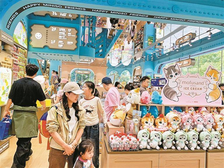 "非常切合当下年轻人的购买需求,美妆区有一些小众品牌的专柜,价格也不贵。"20多岁潮玩爱好者吴女士 告诉记者,她一次性花了200多元,买了卸妆油、香薰、潮玩挂件等。 根据名创优品集团最新财报显示,第二季度该集团总营收达到了49.7亿元,同比增长23.1%。该季度毛利率 44.3%,较去年同期上升40个基点。 当下,深圳正通过"首店经济"推动消费提质升级,而潮玩成为其中的重要内容。 今年7月,深圳大悦城作为粤港澳大湾区首座大悦城,引入英国百年皇室御用玩具品牌Hamleys华南首店,引 来很多网红争先打卡。 金光华广场引入了21家首店品牌,并在B1、B2层引入WANGXIAOBEN、TOP TOY等高流量潮玩品牌。 深圳不仅是中国潮玩产业的策源地,更成为全国潮玩经济的风向标。数据显示,深圳以超3000家潮玩相关企 业数量稳居全国首位,占全国潮玩企业总量的14.4%。这些企业涵盖了从设计、生产到销售、出口等潮玩的 各个环节,形成了完整的产业链。 【深圳商报讯】(记者 李佳佳 文/图)日前,名创优品MINISO FRIENDS华南首店亮相深圳宝安海雅缤纷 城。该店以"迷你IP乐园"为定位,通过沉浸式IP体验与商业空间 ...