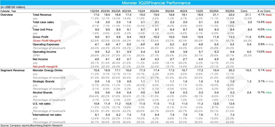 能量饮料龙头怪兽饮料(MNST)于北京时间 2025 年 11 月 7 日早间美股盘后发布了 2025 年第三季度财报(截止 2025 年 9 月)。 1. 收入增速创三年以来单季度新高。3Q25 Monster 实现营收 22 亿美元,同比增长 16.8%,超出市场预期。 量 价拆分来看,Monster 单位箱销量同比增长 17.8%,趋势上延续了二季度的高速增长,核心在于公司从年初开始积极调整了策略,加大了对健康品类的 运营和推新力度,吸引到了大量对健康敏感的增量人群。 价格端同比减少 0.2%,降幅环比前两个季度收窄,核心在于 Ultra(零糖)等高单价产品在公司产品组合中占比提升。 2. 国际市场占比持续提升。从地区上看,美国本土地区实现营收 12.6 亿美元,同比增长 12.4%,重回双位数增长。国际市场实现营收 7.3 亿美元,同比增 长 23.3%,占比进一步提升至 42.6%。 国际增长快主要由于 Monster 针对消费力受损的地区加大了 Fury,Predator 等平价能量饮料的推广,整体来说,无论是大本营还是国际市场均呈现出环 比提速的状态。 3、怪兽饮料主品牌领跑大盘。拆分品牌来看, ...