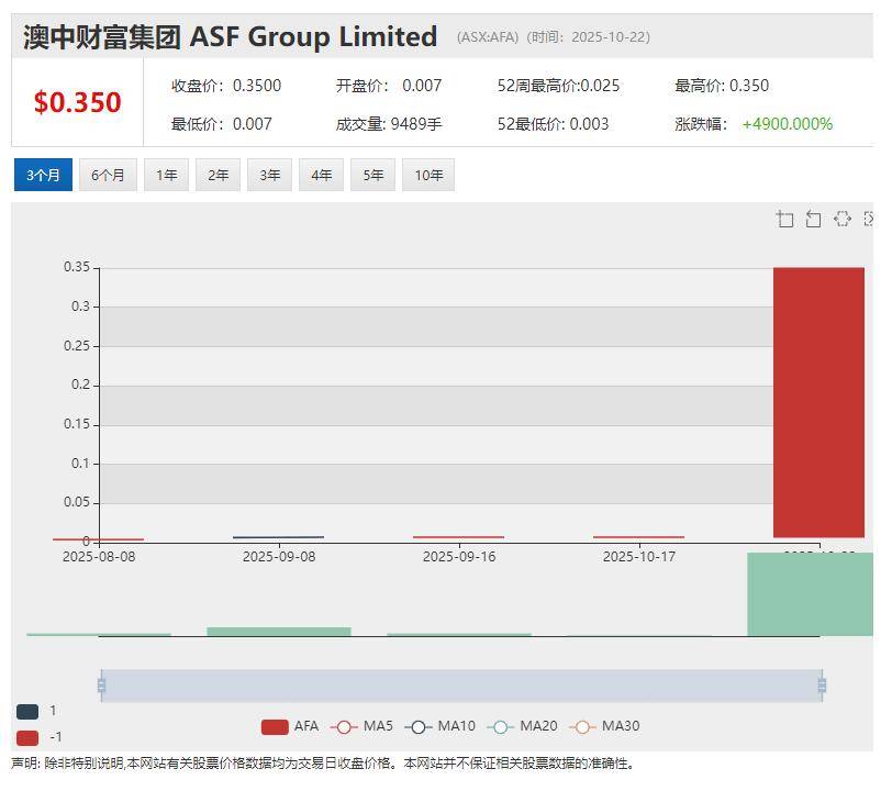 ( 图片来源:《澳华财经在线》) 早盘拉升49倍后紧急停牌 ASF Group (ASX:AFA)宣布注册为数字货币交易所提供商 Asf Group Ltd (ASX股票代码:AFA)周三早盘股价暴涨4900%后紧急停牌,以待回复澳交所股价异动问询。 ASF Capital责任经理Michael Go称,AUSTRAC的注册标志着ASF Capital在将传统金融市场与受监管的数字资产服 务相融合的战略中达到重要里程碑。 ASF Capital未来计划为批发和机构客户开发安全、透明且合规的交易解决方案。 澳华财经在线数据库显示,AFA最新价0.35澳元,已发行股本7.92亿股,市值2.77亿澳元。 截止二季度末公司账面现金结余127万澳元。 (图片来源:AFA公告) (图片来源:ATR公告) 【异动股】传染病检测公司Genetic Signatures (ASX:GSS)季度销售额大幅增长 股价暴涨58% 【异动股】Astron (ASX:ATR)Donald稀土矿砂项目收到出口信贷机构8000万澳元有条件支持函 Astron Ltd (ASX股票代码:ATR) 宣布收到澳大利亚出口信贷机构Export Fi ...