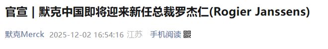 截图来源:默克官微 来源:市场资讯 (来源:求实药社) 12月2日,默克(Merck)宣布,罗杰仁 (Rogier Janssens) 将自 2026 年 2 月 1 日起, 正式担任默克中国 总裁。 此外, 罗杰仁将于 2026 年 1 月 1 日起, 担任默克生命科学中国负责人。这将使中国总裁这一关键职位更 贴近业务一线,以提升默克对市场需求的响应速度与能力。 根据默克新闻稿,「罗杰仁先生曾执掌默克中国医药健康业务达五年 (2017 至 2022 年), 此次重返中国 履新, 他将带领团队全面践行默克在华愿景、加速跨业务和跨职能协同, 并驱动可持续增长」。 现任默克中国总裁何慕麒 (Marc Horn) 因家庭原因将返回德国。 默克已进入中国市场 92 年, 该公司有生命科学、医药健康和电子科技三大业务。过去十年间, 默克在华 投资近 70 亿元人民币,进行多地布局并深化本土合作。目前, 默克在华拥有近 4500 名员工和 21 个法人 实体。 文章内容仅供参考,不构成投资建议。投资者据此操作,风险自担, 关于对文中陈述、观点判断保持中 立,不对所包含内容的准确性、可靠性或完整性提供任何明示或暗示的保证。 ...