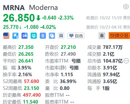 这项关键试验涉及约7,500名16-40岁女性,来自13个国家约300个研究中心,结果显示疫苗对原发性 CMV感染的有效率仅为6%至23%,远低于公司的目标。 | MRNA Moderna | | | | --- | --- | --- | | 26.850 + -0.640 -2.33% | | 收盘价 10/22 15:59 美东 | | 25.770 + -1.080 -4.02% | | 盘前价 10/23 04:18 美东 | | 二 24 4 4 S S 8 同 ♥ 自选 | | ● 快捷交易 | | 最高价 27.350 | 开盘价 27.210 | 成交量 787.17万 | | 最低价 26.265 | 昨收价 27.490 | 成交额 2.1亿 | | 平均价 26.641 | 市盈率TM 亏损 | 总市值 104.87亿 … | | 振 幅 3.95% | 市盈率(静) 亏损 | 总股本 3.91亿 | | 换手率 2.16% | 市净率 1.115 | 流通值 97.94亿 | | 52周最高 57.690 | 委 比 36.99% | 流通股 3.65亿 | | 52周最低 23.1 ...