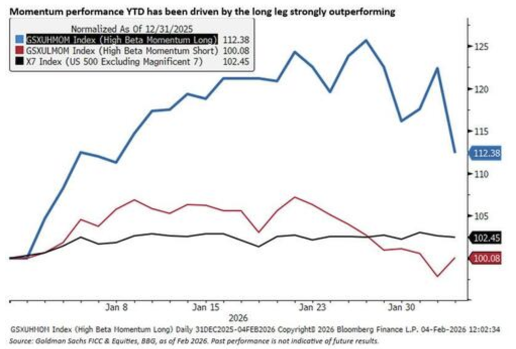 (来源:创业板观察) 自2022年年中以来,动量交易员曾以足以让沃伦·巴菲特感到汗颜的夏普比率统治着市场。然而周三, 这一切几乎遭遇了全线崩盘——他们蒙受了载入史册的损失。 动量交易简单说来就是"买入最近涨得最好的,卖出涨得最差的"。而根据业内的统计,高盛的"高贝 塔"或无约束动量组合(GSPRHIMO)刚刚创下了自2022年以来表现最糟糕的一天,超过了去年1月 Deepseek风暴之后的AI抛售潮。高贝塔股通俗而言就是指那些波动比大盘更剧烈的股票。 如果说,周二市场的跌幅源于软件股因人工智能颠覆风险引发的"投降式"抛售,那么周三的疲软则更集 中于基本面因素与仓位调整,使得大盘指数的变动相对于底层发生的剧烈动荡,显得具有欺骗性的平 稳。 这印证了高盛分析师Lee Coppersmith在上周末文章中的发现,即美股表面平静之下正波涛汹涌。统计显 示,标普500指数成分股平均的1周实际波动率,与整体标普500指数波动率之比在上周四刚刚达到6.88 ——处于2023年以来的第99个百分位。 来源:市场资讯 换句话说,标普500指数成分股的平均波动幅度大约是大盘指数的7倍,这就是为什么近几个交易日部分 个股的异动显得 ...