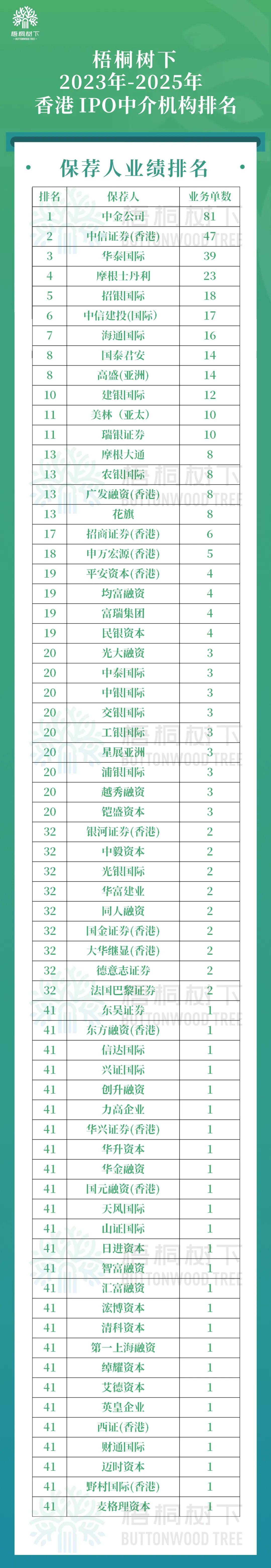 文/飞云 2023-2025年这三年间,港股成功上市企业合计263家,其中GEM 转主板上市5家,介绍上市3家,SPAC 并购上市3家,这11家不纳入本次统计中。港股首 发上市的252家公司的IPO中介机构包括66家券商、67家香港法律顾问、44家中国法律顾问、13家会计师事务所。其中,中金公司保荐81单,位列第一; 高伟绅律所占据香港法律顾问之首,业务单数为33单;竞天公诚占据中国法律顾问之首,业务单数为41单;"四大"则包揽了近90%的审计业务,安永73 单、毕马威55单、罗兵咸永道55单、德勤42单。 一、保荐人业绩排名 2023-2025年,共有66家保荐人为这252家香港IPO上市公司提供了保荐服务,其中联合保荐的拆开计算,各计1单。 榜单前五名: 第一名:中金公司(81单) 第二名:中信证券(香港)(47单) 第三名:华泰国际(39单) 第四名:摩根士丹利(23单) 第五名:招银国际(18单) | | | | 排名 | 保存人 | 业务单数 | | --- | --- | --- | | | 中金公司 | 81 | | 2 | 中信证券(香港) | 47 | | 3 | 华泰国际 | 39 | | ...