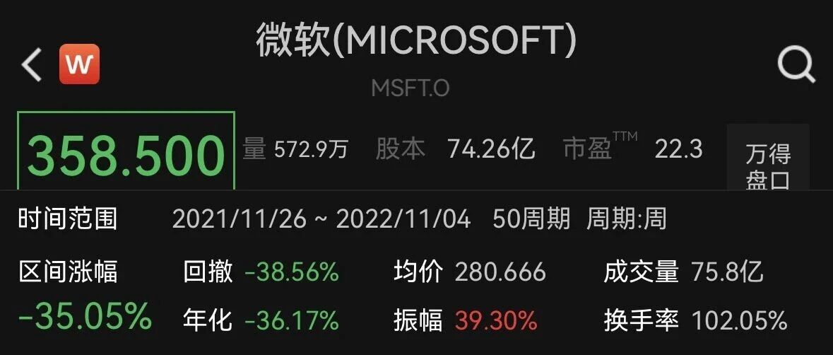 这一轮已经跌了33%了!5个月了。还是有点不敢信! 入行十年多。我很少看到这么跌的微软。从我有工作记忆以来,它几次决策都对的。从软件到云 ai! 微软(MICROSOFT) W MSFT.O 358.500 量 572.9万 股本 74.26亿 市盈™ 22.3 万得 盘口 时间范围 2021/11/26 ~ 2022/11/04 50周期 周期:周 区间涨幅 均价 280.666 成交量 75.8亿 回撤 -38.56% -35.05% 年化 -36.17% 振幅 39.30% 换手率 102.05% 关闭 597.619 552.242 -> 308.854 65.465 20.088 2026-03-27 2021-12-10 2017-08-18 2019-10-18 TRIX(12,9) 0.96 TRMA:0.00 × -0.93 MTR:20.80 ATR:10.33 22年牛转熊,当时6-7个月,最多也就跌了35%。 我都搞懵了。不知道公司管理层做何想? 一代王!现在被抛弃,4月底出财报。大概率毛利率还会掉,股价没有起来的预期!再跌就破了 15年以来的 记录了! ...