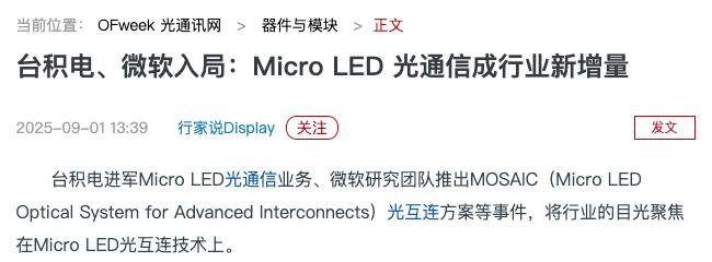 不是,这年头用在电视上的 Micro LED 技术 ,还能做成网线,用来传数据了? 是这样的,前阵子托尼在网上刷到这样一条新闻,说微软正在研究通过 Micro LED 光互联技术(MOSAIC),来解决算力中心的数据传输,被 "卡脖子" 的问题。 而数据中心的端口交换速率,100 Gbps 早就已经是主流,AI 算力中心的交换机,更是要做到 400 Gbps 起步。 emmm,虽然听起来很抽象,但是负责数据处理的算力中心,反过来被数据传输卡了脖子,竟然是因为算力中心的网线 "不够用了"。。。 你可能好奇了,我这会儿上某东搜条超六类的万兆(10Gbps)网线也就十几块钱,咋能不够用呢? 但其实它们跟数据中心用的网线,在连接速率上,差了可不止一个数量级 —— 我们家里的网线,通常能承载的最大速率就是 1000 Mbps - 2500 Mbps,也就是 1 Gbps - 2.5 Gbps。这两年部分地区在推广 "万兆网络",匹配了 10 Gbps 的 网线,但这几乎就是民用网线速率的上限了。 其实就是因为 AI 大模型越来越大,在做训练和推理的时候,服务器之间和 GPU 之间,都得交换大量数据,对带宽的需求也就跟着 ...