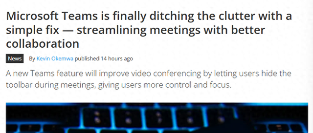 【环球网科技综合报道】2月7日消息,据 Windows Central报道,微软Teams 的一项新功能将允许用户 在会议期间隐藏工具栏,从而改善视频会议体验,使用户能够更好地控制会议内容并集中注意力。 来源:环球网 外媒称,在过去的几个月里,微软为其Teams 引入了许多新功能,包括将应用程序固定到其他窗口之上 的功能,以确保在切换任务时应用程序保持可见,从而增强多任务处理能力。 根据微软 365 产品路线图,隐藏工具栏新功能预计将于 3 月正式发布,让用户在会议期间可以腾出更多 被控制栏占据的屏幕空间。不过,该功能需要手动启用,也就是说,用户需要进入设置才能开启它。 值得注意的是,此功能并不会完全移除会议界面中的控制栏。用户可以将鼠标悬停在其上方,快速将其 调回屏幕。或者,用户也可以按 Tab 键。(思瀚) ...