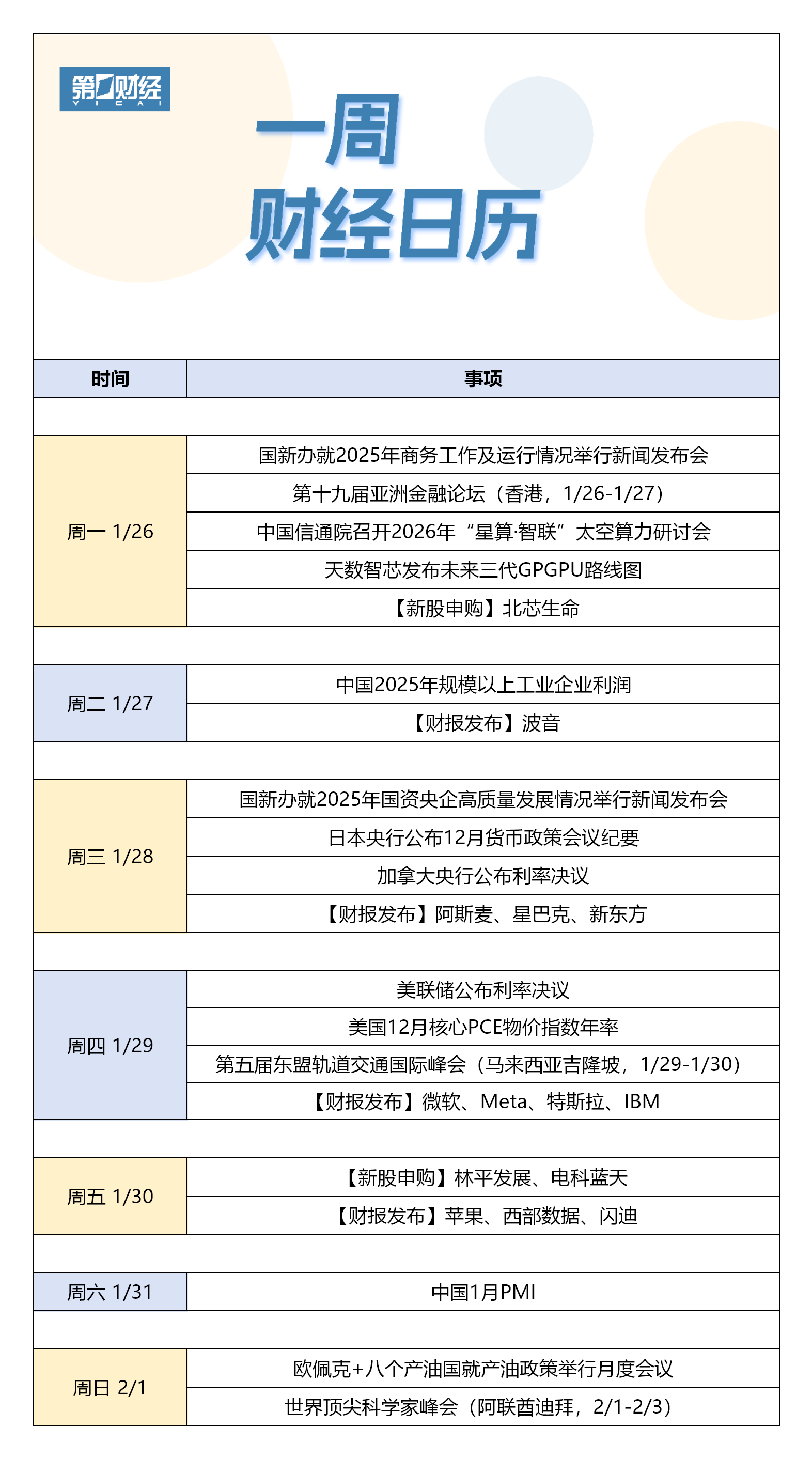 | 周三 1/28 | 日本央行公布12月货币政策: | | --- | --- | | | 加拿大央行公布利率决 | | | 【财报发布】 阿斯麦、星巴克 | | 周四 1/29 | 美联储公布利率决议 | | | 美国12月核心PCE物价指数 | | | 第五届东盟轨道交通国际峰会(马来西亚¡ | | | 【财报发布】微软、Meta、特 | | 周五 1/30 | 【新股申购】林平发展、电 | | | 【财报发布】苹果、西部数 | | 周六 1/31 | 中国1月PMI | | 周日 2/1 | 欧佩克+八个产油国就产油政策² | | | 世界顶尖科学家峰会(阿联酋迪拜 | 1月PMI数据将发布;美联储将公布利率决议;苹果、特斯拉、微软、Meta等美股科技巨头将集中披露财报…… ...