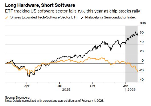 Got to talk about software looking a little sick, but this is nothing new. We've been tracking the dichotomy between semiconductors and software for a while. Neither one had a particularly good day, but uh software came out way worse.And let's just take a look. This is our heat map of software today. Only Cisco in the green.This is not comprehensive, but you sort by performance. You can see, look, a lot of these names down 9 10%. So, this is kind of a big deal here.And then if we take a look at the year-to ...