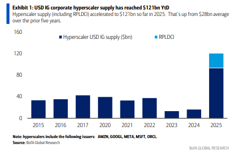 美银最新报告揭示了美国科技巨头前所未有的发债狂潮,以及其对信用债市场造成的冲击。 高额发债或成常态,利差已具吸引力? 展望未来,发债潮似乎并未结束。根据2026年共识预测,不同云巨头面临的融资需求差异显著。Meta和甲骨文的资本支出预计将超过经营现金流减去股 息和股票回购后的可用现金,而谷歌的资本支出预计与可用现金流基本持平。 据追风交易台,美国银行在最新报告中指出,美国五大云计算巨头(亚马逊、谷歌、Meta、微软、甲骨文)今年迄今的总发行量达到惊人的1210亿美 元,是过去五年平均280亿美元的四倍有余。 这场债券供应洪流对市场造成显著冲击,云巨头债券利差大幅扩大,其中甲骨文利差扩大48个基点,Meta和谷歌分别扩大15和10个基点,明显跑输整体 投资级债券指数。 同时,美银认为,2026年预计供应量维持在1000亿美元左右,不会进一步加速。市场已经消化了供给高峰的冲击,在发行节奏趋于稳定的预期下,当前 被"砸"出的更高收益率,可能为投资者提供了一个难得的切入点。 利差急剧扩大,大幅跑输大盘 自9月以来,五大云计算巨头已累计发行810亿美元的美元投资级债券。加上今年早些时候的零星发债以及10月份270亿美元 ...