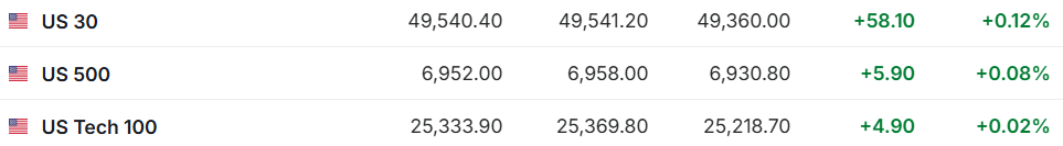 1. 2月26日(周四)美股盘前,美股三大股指期货齐涨。截至发稿,道指期货涨0.12%,标普500指数期货涨0.08%,纳指期货涨0.02%。 | ■ US 30 | 49,540.40 | 49,541.20 | 49,360.00 | +58.10 | +0.12% | | --- | --- | --- | --- | --- | --- | | ■ US 500 | 6,952.00 | 6,958.00 | 6,930.80 | +5.90 | +0.08% | | ■ US Tech 100 | 25,333.90 | 25,369.80 | 25,218.70 | +4.90 | +0.02% | 2. 截至发稿,德国DAX指数涨0.46%,英国富时100指数涨0.19%,法国CAC40指数涨0.92%,欧洲斯托克50指数涨0.37%。 伊美第三轮谈判暂停,将于晚些时候恢复。据伊朗媒体以及阿曼方面确认,伊美在瑞士日内瓦举行的新一轮间接谈判暂停,计划于当天 晚些时候继续进行。阿曼方面表示,今日在日内瓦交换了富有创意且积极的方案,希望美伊谈判能取得更多进展。据报道,一辆据信载 有美国外交官的车队已离 ...