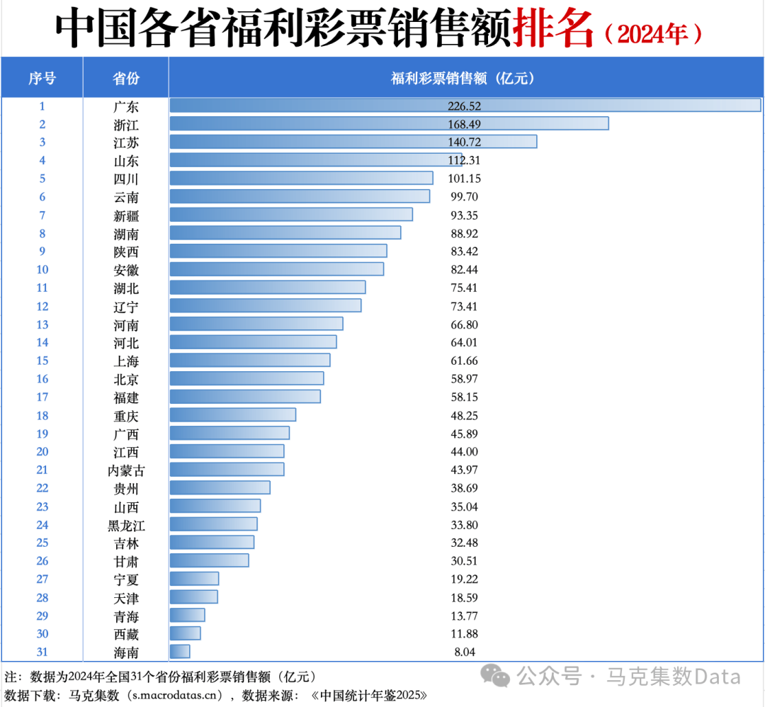 | 福利彩票销售额(亿元) | 序号 | 省份 | | | | | --- | --- | --- | --- | --- | --- | | 广东 | 226.52 | 1 | 168.49 | 2 | 浙江 | | 140.72 | 3 | 江苏 | 112.31 | 4 | 山东 | | 5 | 四川 | 101.15 | 云南 | 99.70 | 6 | | 新疆 | 7 | 93.35 | 88.92 | 8 | 湖南 | | 9 | 陕西 | 83.42 | 10 | 安徽 | 82.44 | | 11 | 湖北 | 75.41 | 12 | 辽宁 | 73.41 | | 13 | 河南 | 66.80 | 64.01 | 14 | 河北 | | 15 | 上海 | 61.66 | 16 | 北京 | 58.97 | | 17 | 福建 | 58.15 | 18 | 重庆 | 48.25 | | 广西 | 19 | 45.89 | 20 | 江西 | 44.00 | | 21 | 内蒙古 | 43.97 | 22 | 38.69 | 贵州 | | 23 | 35.04 | 山西 | 黑龙江 | 2 ...