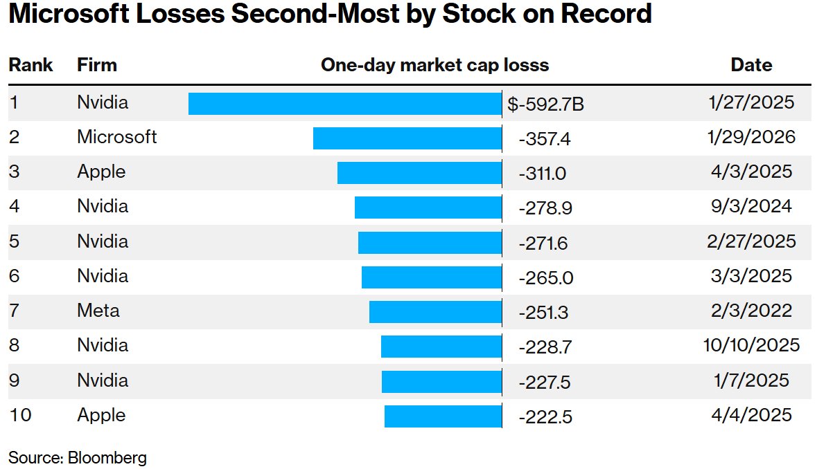 Core Viewpoint - Microsoft experienced a significant stock sell-off, resulting in a market cap loss of $357 billion, marking the second-largest single-day market cap loss in U.S. history [1][3]. Group 1: Market Performance - Microsoft's stock price plummeted by 10%, the largest single-day decline since March 2020 [1]. - The company's market cap loss exceeded the total market cap of over 90% of the S&P 500 index members [1]. - This event follows a historical precedent where Nvidia faced a $593 billion market cap loss in January 2022 [1][2]. Group 2: Financial Results and AI Investment - Microsoft's recent earnings report revealed record AI spending, with capital expenditures increasing by 66% to $37.5 billion [3]. - The growth rate of the Azure cloud computing business has slowed compared to the previous quarter [3]. - Microsoft faces capacity constraints in AI demand, with remaining performance obligations (RPO) totaling $625 billion, of which approximately 45% is linked to its partnership with OpenAI [3]. Group 3: Market Sentiment and Analyst Commentary - There is growing skepticism among investors regarding the return on investment (ROI) from Microsoft's substantial AI expenditures [3]. - Analysts suggest that Microsoft's stock may need to be revalued to align with its historical fair value due to the perceived lack of strong ROI from AI investments [3].