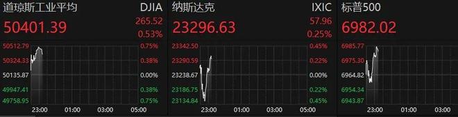 来源:证券时报e公司 2月10日晚间,美股走势分化。黄金巨震。 美股三大指数集体高开,随后维持震荡,截至发稿,纳指再度上涨。 | 道琼斯工业平均 | | | | DJIA 纳斯达克 | | | | IXIC 标普500 | | | | --- | --- | --- | --- | --- | --- | --- | --- | --- | --- | --- | | 50401.39 | | | 265.52 | 329663 | | | 57.96 | 6982 02 | | | | | | | 0.53% | | | | 0.25% | | | | | 50512.79 | | | 0.7596 | 23342.50 | | | 0.4596 | 6985.77 | | | | 50324.33 + | | | 0.3896 | 23290.59 | | | 0.2296 | 6975:30 | | | | 50135.87 | | | 0.0096 | 23238.67 | | | 0.0096 | 6964.82 | | | | 49947.41 | | | 0.38% | 23186.75 | | ...