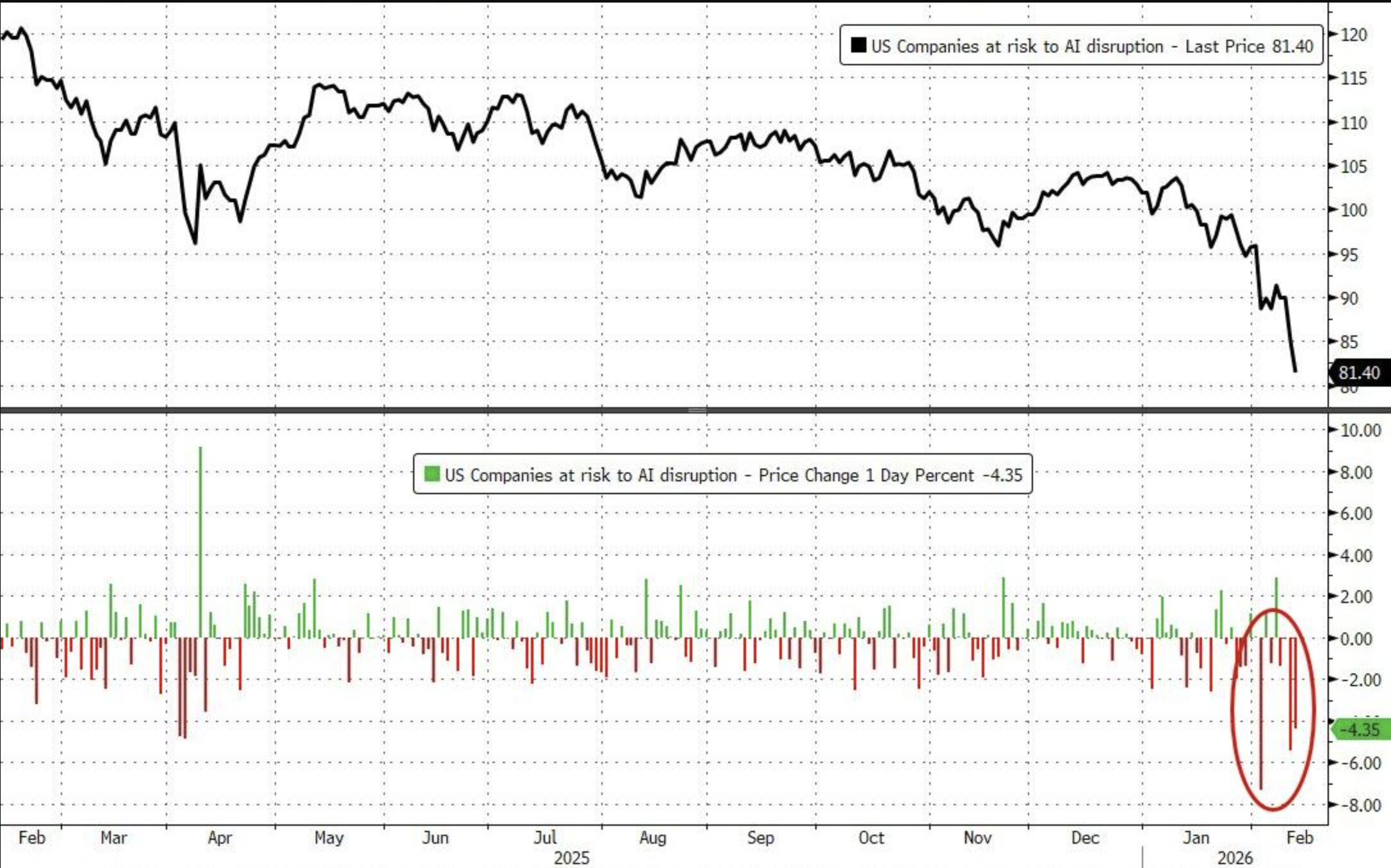 Core Viewpoint - The U.S. stock market is experiencing a rare and widespread panic sell-off, driven by concerns over AI's disruptive potential across various sectors [1][3] Market Behavior - Over 40 S&P 500 stocks exhibited abnormal volatility exceeding three standard deviations, marking the highest level observed by Goldman Sachs trader Ryan Shakey [1] - Defensive sectors such as utilities, consumer staples, REITs, and healthcare are leading the market, while technology, media, and telecommunications are facing significant declines [1] - The Goldman Sachs AI risk exposure basket (GSTMTAIR) saw a sharp drop of 510 basis points in a single day, indicating heightened market sensitivity to AI-related risks [1] Investor Sentiment - Investor sentiment has shifted dramatically, with a notable loss of appetite for bottom-fishing, as hedge funds and long institutions are selling off but at smaller scales, indicating a growing sense of fatigue [4] - The market breadth has deteriorated sharply, with 350 S&P 500 stocks declining, and major tech companies like Apple, Amazon, Microsoft, Meta, and Cisco dragging down the index [5] Sector-Specific Impacts - The logistics sector has become a recent focal point, with CH Robinson experiencing an eight-standard deviation drop, reflecting the spread of AI panic from tech to traditional industries [6] - Financial stocks, previously seen as safe havens, are also under pressure, with regional banks losing their appeal as attractive investments [6] - The healthcare sector has seen a 32% drop in contract research organizations (CROs) this month, following Pfizer's announcement to utilize AI for most clinical trials [6] Reassessment of AI Winners - The technology, media, and telecommunications sectors, excluding storage chips, are facing widespread declines, as previously regarded "winners" are being sold off amid risk-averse sentiment [7] - Investors are confused about the underlying issues in earnings reports, as fundamental analysis appears to be overlooked in the current panic environment [7]