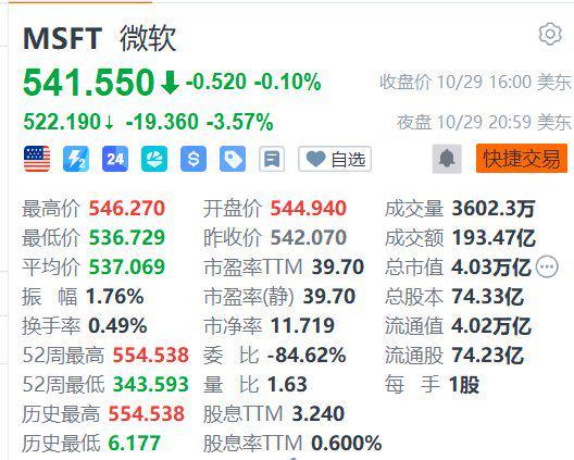 美股异动丨微软夜盘跌3.5%,Azure及其他云端收入低于买方预期,AI开支急增