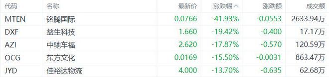 | 代码 | 名称 | 最新价 | 涨跌幅 へ | 涨跌额 | 成交额 | | --- | --- | --- | --- | --- | --- | | MTEN | 铭腾国际 | 0.0766 | -41.93% | -0.0553 | 2633.94万 | | DXF | 益生科技 | 1.660 | -19.42% | -0.400 | 17.17万 | | AZI | 中驰车福 | 2.620 | -17.87% | -0.570 | 120.59万 | | OCG | 东方文化 | 0.0169 | -15.50% | -0.0031 | 863.47万 | | JYD | 佳裕达物流 | 4.000 | -13.70% | -0.635 | 62.68万 | 中概股收盘跌幅居前的个股为:铭腾国际跌41.93%,益生科技跌19.42%,中驰车福跌17.87%,东方文 化跌15.5%,佳裕达物流跌3.7%。(格隆汇) ...