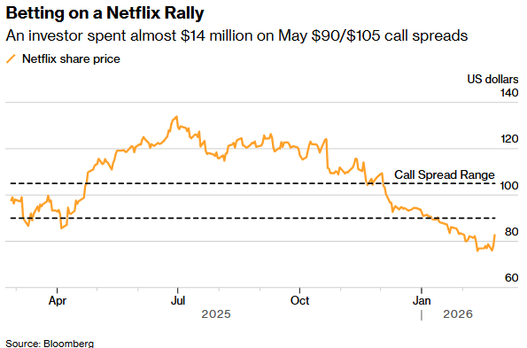 智通财经APP获悉,据期权市场数据显示,一位神秘交易员近日建立了一笔价值近1400万美元的奇特头 寸,押注流媒体巨头奈飞(NFLX.US)即便在竞购华纳兄弟探索公司(WBD.US)的角逐中落败,其股价仍 可能迎来上涨。 具体操作上,该投机者于周三买入5.5万份奈飞5月到期的90美元看涨期权,同时卖出同等数量的105美 元看涨期权,以此部分冲抵权利金成本。这种期权价差策略合约单价约2.51美元,合计权利金支出达 1380万美元。若奈飞股价从当前83美元水平启动涨势,该策略将赋予持有者以特定价格购入550万股股 票的权利。 事件背景方面,派拉蒙天舞公司(PSKY.US)周二提出每股31美元的新收购要约,较奈飞此前与华纳兄弟 达成的每股27.75美元协议更具竞争力。 尽管华纳兄弟尚未撤销对奈飞收购方案的支持建议,但承认派拉蒙的最新报价已达到进一步磋商的触发 条件。根据协议,若奈飞竞购失败,将可获得28亿美元的分手费。 受此刺激,奈飞股价周三飙升6%,创下四月以来最大单日涨幅。JonesTrading事件驱动策略专家指出, 该期权组合的巧妙之处在于,若派拉蒙最终胜出反而可能引发奈飞股价反弹。 假设5月15日期权到期前 ...