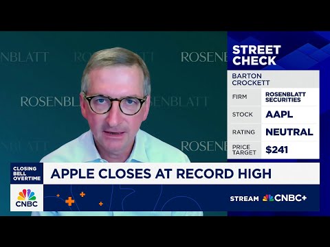 Joining us now is Barton Crockett from Rosenblat Securities. Barton, welcome. So, uh, from the September event, that dropping event when it was trading at 226, now it's at 262.So, kind of nice switch there. You're still neutral on it, but is Apple addressing enough of what the consumer wants that maybe this AI delay doesn't matter as much as the naysayers thought. You know, it's hard for me to get to a place where I'm going to argue that uh Apple is going to be growing earnings per share sustainably in the ...